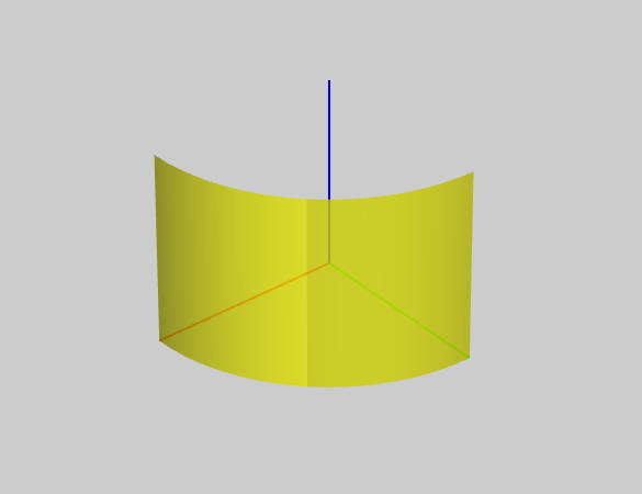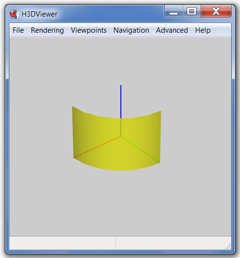 | 7 | <meta name='description' content='This scene contains a single NurbsPatchSurface rendering one-quarter of a cylindrical segment. The "solid" field of the surface is set false for so that surface is visible from both sides. Surface has semi-transparent material appearance. Scene also contains unit-length line segments defining x-y-z coordinate axes. Defined Viewpoints show the inner and outer sides of the cylindrical surface'/> |