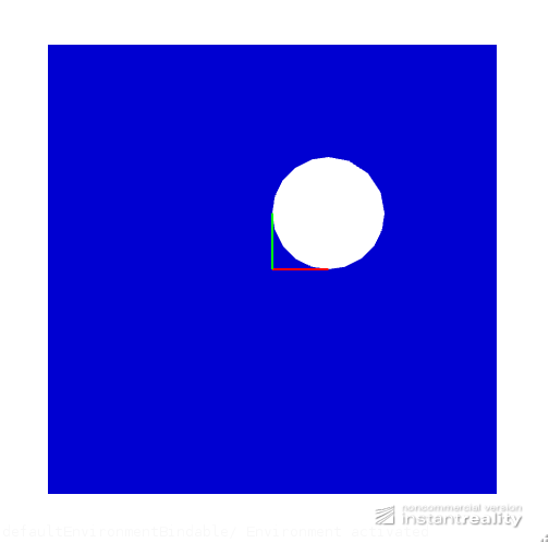 | description | A NurbsTrimmedSurface node rendering a square centered on the origin in the x-y plane; with sides 8 units length. A trimming curve is used to cut out a circle of radius 1 unit centered at the point (x,y)=(1,1) . Red (x), Green (y) and Blue (z) line segments represent the x-y-z unit axes. |