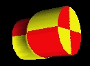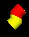 Map a PixelTexture image to an Extrusion. The PixelTexture is RED (lower left quarter), YELLOW (lower right quarter), YELLOW (upper left quarter) and RED (upper right quarter). A PixelTexture is applied to an Extrusion by aligning the bottom of the PixelTexture with the first cross-section at the first spint point, and the top of the PixelTexture coincides with the last cross-section at the last spine point. The left side of the PixelTexture is aligned with the first cross-section point of all spine points, and the right side of the PixelTexture coincides with the last cross-section point for all spine points. For the ends of the extrusion, The PixelTexture will map with the S (horizontal) texture axis aligning with the X axis of the cap, and the T (vertical) texture axis aligning with the Z axis of the cap.