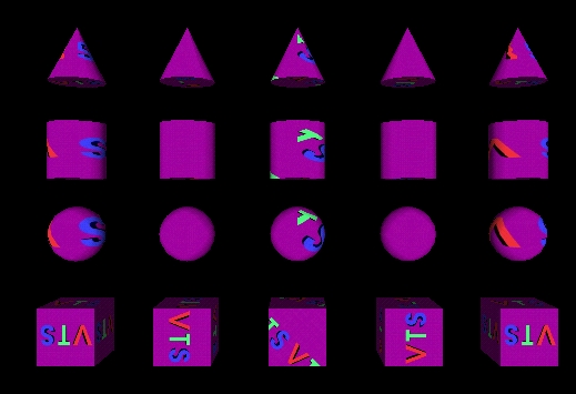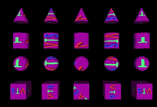 | 23 | <meta name='description' content='Test rotation field for MovieTexture mapping to primitive geometry. Test browser ability to apply rotations of (left to right) -180, -90, +45, +90 and +180 degrees to an MovieTexture mapped to the faces of primitive geometry, using default primitive mapping rules. The result is (for all geometry faces): the first column of geometry should show the VTS logo upside-down and spelling to the left for all faces. The second column of geometry should map the VTS logo with the positive horizontal direction pointing up, and the positive vertical axis pointing left. The third column should map the VTS logo right side up, on a downward 45 degree angle. The fourth column should map the VTS logo vertically downward, with the +T direction to the right. The fifth column should be identical to column #1.'/> |
