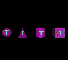 Test mapping PNG ImageTexture to all primitive geometry. Test browser ability to map an RGB (24 bit color) and 8 bit "palette" on a purple background should map onto a sphere, cone, cylinder and box. The "palette" version of the ImageTexture is mapped to the Sphere and the Cone. The RGB 24 bit color ImageTexture is mapped to the Cylinder and Box. For the sphere the texture should cover the entire surface, and wrap counterclockwise from the back of the sphere. For the cone, the texture should wrap counterclockwise (from above) starting at the back of the cone. A circle cutout of the texture is applied right side up to the base of the cone when the cone is tilted toward the -z axis. For the cylinder, the texture should wrap counterclockwise (from above) starting at the back of the cylinder. A circle cutout of the texture is applied right side up to the top and bottom caps of the cylinder. For the box, the texture should be applied right side up in its entirety to each face of the box.