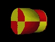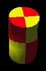 Map a PixelTexture image to an Extrusion. The PixelTexture is RED (lower left quarter), YELLOW (lower right quarter), YELLOW (upper left quarter) and RED (upper right quarter). A PixelTexture is applied to an Extrusion by aligning the bottom of the PixelTexture with the first cross-section at the first spint point, and the top of the PixelTexture coincides with the last cross-section at the last spine point. The left side of the PixelTexture is aligned with the first cross-section point of all spine points, and the right side of the PixelTexture coincides with the last cross-section point for all spine points. For the ends of the extrusion, The PixelTexture will map with the S (horizontal) texture axis aligning with the X axis of the cap, and the T (vertical) texture axis aligning with the Z axis of the cap.
