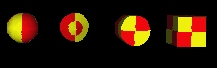Test browser ability to map full RGB color pixel values to geometry. A checkerboard of four colored squares: lower left (red), lower right (yellow), uppser left (yellow) and upper right (red) map onto the faces of all geometry. For the sphere, the texture should cover the entire surface, and wrap counterclockwise from the back of the sphere. For the cone, the texture should wrap counterclockwise (from above) starting at the back of the cone. A circle cutout of the texture is applied right side up to the base of the cone when the cone is tilted toward the -z axis. For the cylinder, the texture should wrap counterclockwise (from above) starting at the back of the cylinder. A circle cutout of the texture is applied right side up to the top and bottom caps of the cylinder. For the box, the texture should be applied right side up in its entirety to each face of the box.