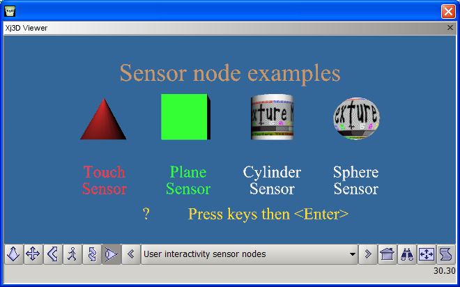 | 6 | <meta name='description' content='A collection of all of the user interactivity sensor nodes: TouchSensor, PlaceSensor, CylinderSensor, SphereSensor, KeySensor, and StringSensor.'/> |
